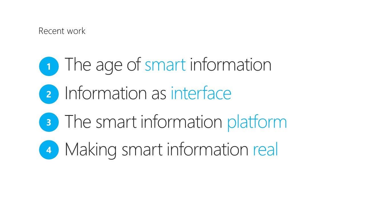 I’ve always been involved in things that were information-based and visual. Over the years, I’ve worked for companies like Adobe, lots of Silicon Valley start-ups, and now Microsoft for the last 15 years. All along the way, I’ve been very, very fortunate to be able to stay in the both design and coding types of jobs.