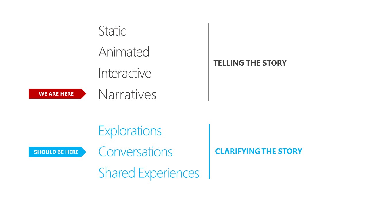 Jon : I’m curious, for a while there’s been interactive visualizations, but they’re really static visualizations that have some sort of interactivity just layered on top. It’s a chart with three lines on it where the visualization allows you click a point or a line and it highlights. I wonder whether you think that level of interaction actually helps people get this moment of clarity or if it’s just gratuitous, and going forward whether you think that type of interactivity is not going to be as common? Is it not going to be used as much because it doesn’t necessarily help people better understand, but just allows them really to just play with something?